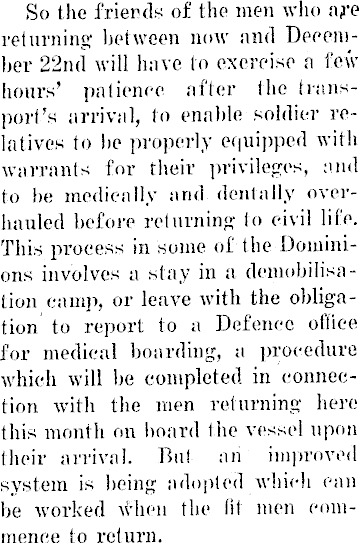 So the friends of the men who aye returning between now and December 22ml will have to exercise a few hours’ patience after the transport’s arrival, to enable soldier relatives to he properly equipped with warrants for their privileges, and to he medically and dentally overhauled before returning to civil life. This process in some of the Dominions involves a stay in a demobilisation cauup or leave with the obligation to report to a Defence office for medical boarding, a procedure which will be completed in connection with the men returning here this month on hoard the vessel upon their arrival. But an improved system is being adopted which can be worked when the lit men commence to return.