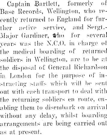 Captain Bartlett, formerly of Base Records, Wellington, who recently returned to England for further active service, and Sergl.Major Gardiner, tfrho for several years was the N.C.O. in charge of the medical hoarding of returned soldiers in Wellington, are to he at the disposal of General Richardson in London for (he purpose of instructing staffs which will he sent out with each transport to deal with the returning soldiers en route, enabling them to disembark on arrival without any delay, whilst hoarding arrangements are being carried out as at present.