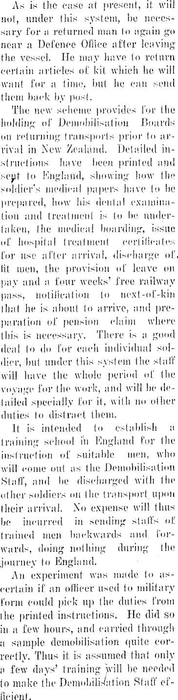 As is the ease at present, it will not, under this system, he necessary for a returned man to again go near a Defence Office after leaving the vessel. He may have to return certain articles of kit which he will want for a time, hut he can send them back by post. The new scheme provides for the holding of Demobilisation Boards on returning transports prior to arrival in New Zealand. Detailed instructions have been printed and sept to England, showing how the soldier’s medical papers have lo he prepared, how his denial examination and treatment is to he undertaken, (he medical hoarding, issue of hospital treatment certificates for use after arrival, discharge of, tit men, the provision of leave on pay and a four weeks’ free railway pass, notification to uexl-of-kin that he is about to arrive, and preparation of pension claim where this is necessary. There is a good deal lo do for each individual soldier, hut under this system the staff will have the whole period of the voyage for the work, and will he detailed specially for it, with no other duties to disti’aet them. It is intended to establish a training school in England for the instruction of suitable men, who will come out as the Demobilisation Staff, and he discharged with (lie other soldiers on (lie transport,, upon their arrival. No expense will thus he incurred in sending stalls of (rained men backwards and forwards, doing nothing during the .journey to England. An experiment was made to ascertain if an officer used lo military form could pick up the duties from the printed instructions. Ho did so in a few hours, and carried through a sample demobilisation quite correctly. Tims it is assumed that only a few days’ training yvill he needed to make the Demohili.Jation Staff efficient.