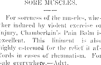 SURE MUSCLES. For soreness oi; the muscles, whether induced by violent exercise or injury, Chamberlain's Pain Balm is excellent. This liniment is also highly esteemed tier the relief it affords in ease's of rheumatism. For '.•lie everywhere.—Advt.