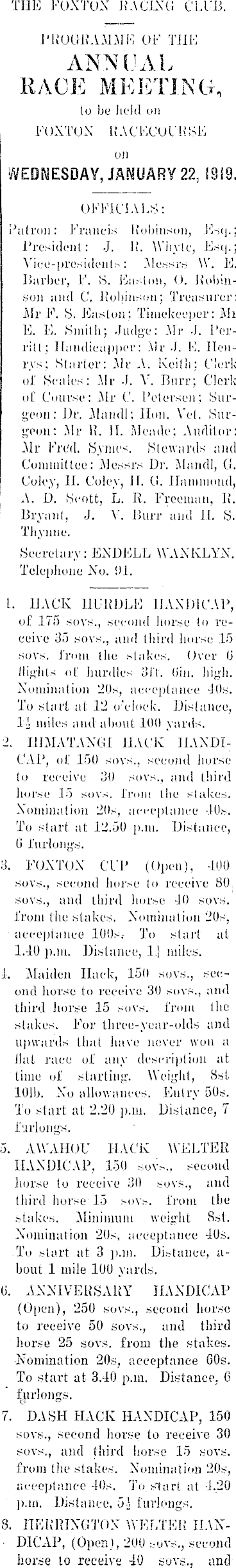 THE EOXTUX R.VCLXG CLCD. PRUGRAAIAIE OF TJIE ANNUAL RACE MEETING, to be held on EOXTUX RACECOURSE on iVEDWESDAY, JANUARY 22, S9S9. OFFICIALS: Falron: .Francis Robinson, Esq.; President: J. R. Whyte, Esq.; Vice-presidents: .Messrs \V. E. Barber, E. S. Easton, O. Robinson and C. Robinson; Treasurer: Mr F. S. Easton; Timekeeper: Air E. E. (Smith; Judge: Air J, Perrill; Handieapper; Mr J. E. Ilenrys; Starter: Air A. Keith: Clerk oi - Scales: Air J. V. Burr; Clerk of Course: Air C. Petersen; Surgeon; Dr. Ala mil; Hon. Vet. Surgeon; Air R. 11. Aleade; Auditor; Air Fml. Symes. Stewards and Committee: Aiessrs Dr. Alnndl, 0. Coley, 11. Coley, 11. C. Hammond, A. D. (Scott, L. R. Freeman, R. Bryant, J. V. Burr and H. S. Thynne. Secretary: EXDELL WAXKLYX. Telephone Xo. 01. 1. HACK HURDLE HAXDICAP, of 175 sovs., second horse to receive 35 so\’s., and third horse 15 sows. J'rom the slakes. Over (J llights of hurdles 3ft. bin. high. Xominalion 20s, acceptance 40s. To start at 12 o'clock. Distance, 14 miles and about 100 yards. 2. IHAIATAXGI HACK HANDICAP, of 150 soys., second horse to receive 30 sovs., and third Jior.se 15 sovs. from the stakes. Xomination 20s, acceptance 40s. To start at 12.50 p.m. Distance, b furlongs. 3. FDXTOX CUP (Open), 400 sovs., second horse to receive 80. sovs., and third horse 40 sovs. from the stakes. Xominalion 20s, acceptance 100 s- To start at 1.40 p.m. Distance, 11 miles. I. Alaiden Hade, 150 sovs., second lior.se to receive 30 sovs., and third horse 15 sovs. from the stakes. For three-year-olds and upwards that have never won a Hat nice of any description at time of starting. Weight, fist 101 b. Xu allowances. Entry 50s. To start at 2.20 p.m. Distance, 7 furlongs. 5. AWAHOU HACK WELTER HANDICAP, 150 sov>., second horse to receive 30 sovs., and third horse-15 sovs. from the stakes. Minimum weight fist. Xominalion 20s, acceptance 40s. To start at 3 p.m. Distance, about 1 mile 100 yards. 0. AXXIVERSARY HANDICAP (Open), 250 sovs., second horse to receive 50 sows., and third horse 25 sovs. from the stakes. Xomination 20s, acceptance 60s. To start at 3.40 p.m. Distance, 6 ' furlongs. 7. DASH HACK HANDICAP, 150 sovs., second horse to receive 30 sovs., and third horse 15 sovs. from the slakes. Nomination 20s, acceptance 40s. To start at 4.20 p.m. Distance, 51 furlongs. 8. HERRINGTON WELTER lIAX- ■ DICAP, (Open), 200 sows., second horse to receive 40 sovs., unci