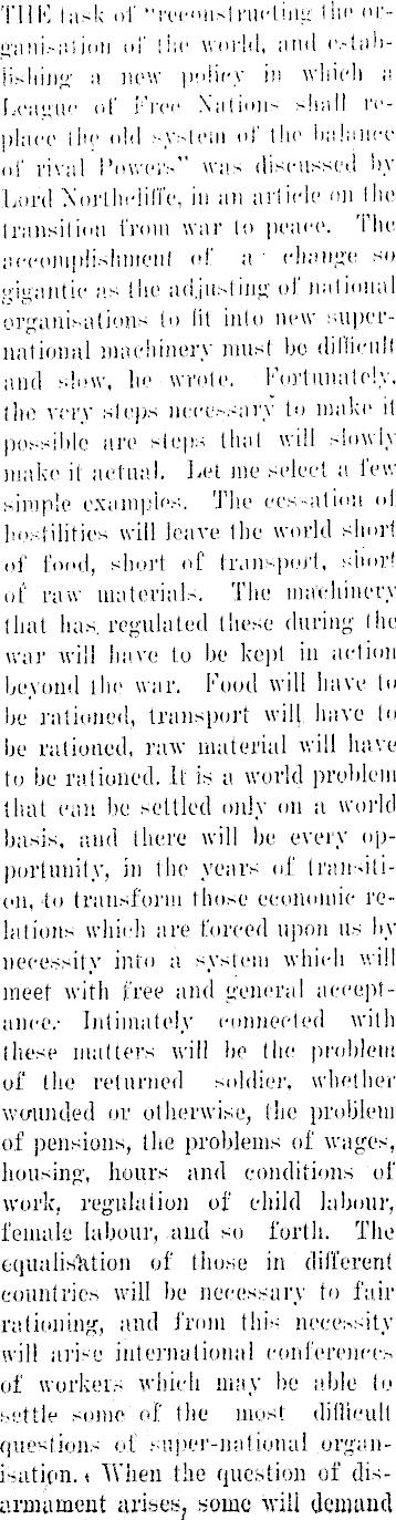 T.IIK task of *'i-ccoii.-!ru<-linu I he or-.gani.-alion of liic world, and c.-lab-lishing a new ) >• > licy in which a League of Free Nations shall replace liu' old M'l'lcai ot the balance id' rival 1 ’ewer;-’' was discussed by Lord Northi-lilfe, in an article on the transit inn from war to peace. The. accomplishment of a ' change so gigantic a.s the adjusting of national organisations to lit into new supernational machinery must be difficult and slow, he wrote. Fortunately, the very steps necessary to make it possible are steps that will slowly make it actual. Let me select a few simple examples. The ces-alimi id. hostilities will leave the world short of food, short of transport, short of raw materials. The machinery that has. regulated these during the war will have to be kept in action beyond the war. Food will have to be rationed, transport will have to be rationed, raw material will have to be rationed. It is a world problem that mm be settled only on a world basis, and there will be every opportunity, in the years of transition, to transform those economic relations which are forced upon us by necessity into a system which will meet with free and general acceptance.- Intimately connected with these matters will ho the problem of the returned soldier, whether wounded or otherwise, the problem of pensions, the problems of wages, housing, hours and conditions of work, regulation of child labour, female labour, and so forth. The equalisation of those in different countries will he necessary to fair rationing, and from tin's necessity will arise international conferences of workers which may he able to settle some of the most diOicult questions of super-national organisation. * When the question of disarmament arises, some will demand