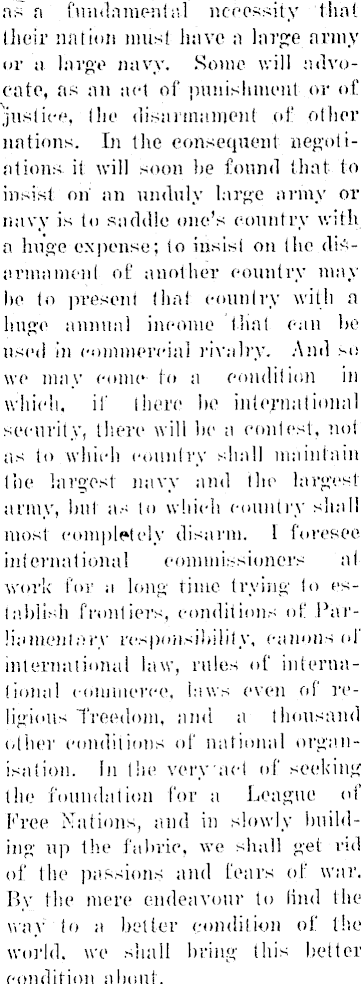 a fundamental necessity 'that their nation must have a large army or a large navy. Some will advocate, as an act of punishment- or of justice, (lie disarmament of other nations. In the consequent negotiations it will soon he found that to insist on an unduly large army or navy is to saddle one’s country with a huge expense; to insist on (ho disarmament of another country may he to present (hat country with a huge annual income that can he used in commercial rivalry. And so we may come- to a eondilion in which, if there he international security, there will he a contest, not as to which country shall maintain the largest navy and the largest army, hat as to which country shall most completely disarm. 1 foresee iniernationa! commissioners at work for a long time trying to establish frontiers, conditions of Parliamentary responsibility, canons ol International law, rules of international commerce, laws even of religious freedom, and a thousand other conditions of national organisation. in (lie veryact of seeking the foundation for a League of Free Nations, and in slowly building up the fabric, we shall get rid of the passions and fears of war. By the mere endeavour to lind the way'to a belter condition of the world, we shall bring this bettor condition about.