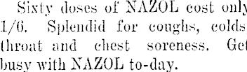 Sixty doses of NAZOL cost only 1/0. Splendid for coughs, colds, throat and chest soreness. Get busy with NAZOL to-day.