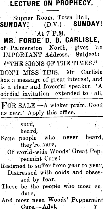 LECTURE ON PROPHECY. Supper Room, Town Hall, SUNDAY! (D.V.) SUNDAY! At 7 P.M. MR. FORDE D. B. CARLISLE, of Palmerston North, gives an IMPORTANT Address. Subject: <“THE SIGNS OF TljfE TIMES.” DON’T MISS THIS. Mr Carlisle has a message of great interest, and is a clear and forceful speaker. A cordial invitation extended to all. 7?OR SALE. —A wicker pram. Good as new; Apply this office. surd, heard, Sane people who never heard, they’re sure, Of world-wide Woods’ Great Peppermint Cure! Resigned to suffer from year to year, Distressed with colds and obsessed by fear, These be the people who most endure, And most need Woods’ Peppermint Cure. —Advt 7