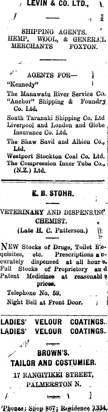 ./ LEVIN & CO. LTD., SHIPPING AGENTS. HEMP, TV 'POL, & GENERAL MERCHANTS FOXTON. AGENTS FOR— \ “Kennedy” i Tlxe Manawatu River Service Co.. “Anchor” Shipping & Foundry ■ Co. Ltd. South Tai’anaki Shipping Co. Ltd j Liverpool and London and Globe . Insurance Co. Ltd. > The Shaw Savil and Albion Co., 5 Ltd. i Westport Stockton Coal Co. Ltd. j The Compression Inner Tube Co., 1 (N.Z.) Ltd. ! E. B. STOHR. VETERINARY AND DISPENS.tNC ! CHEMIST. ; (Late H. C. Patterson.) \'t \ NEW Stocks of Drugs, Toilet E'cquisites, etc. Prescriptions accurately dispensed at all hours. Full Stocks of Proprietory an d Patent Medicines at reasonable prices. Telephone No. 59. 4 Night Bell at Front Door. \ 1 LADIES' VELOUR COATINGS. LADIES’ VELOUR COATINGS. BROWN’S. TAILOR AND COSTUMIER. 17 RANGITIKEI STREET, PALMERSTON N. . ‘* \ J ’Rhones ; Shop §67; Evidence 3.334,