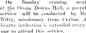 On Sunday evening next at the Oroua Downs Hall, a gospel service will lie conducted by Mr Witty, missionary from Ceylon. A hearty invitation i.- extended everyone to allend t hm service.