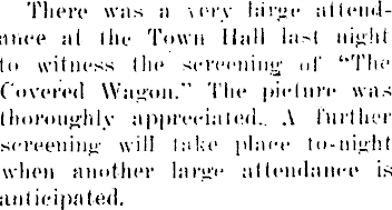 There was a very large attendance at the Town Hall last night to witness tin* screening of ‘‘The Covered Wagon." The picture was thoroughly appreciated. A further screening will lake place to-night when another large attendance is anticipated.