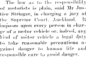 The law as to the responsibility of motorists is [>lain. said Mr -Inslice Stringer, in charging a jury at the Supreme Court. Auckland. It imposes upon every person in charge of a motor vehicle or. indeed, any kind of motor vehicle a legal duty to take reasonable precautions against danger to human life and responsible care to avoid danger.