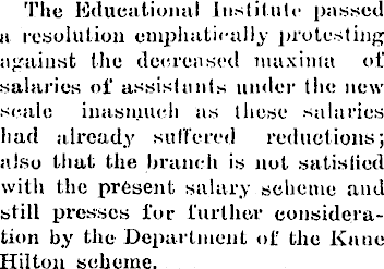 'Flic Kdueational Instilutc passed a resolution emphatically protesting against the decreased maxima of salaries of assistants under the new scale inasmuch as these salaries had already suffered reductions; also that the branch is not satisfied with the present salary scheme and still presses for further consideration by the Department of the Kaue Hilton scheme.