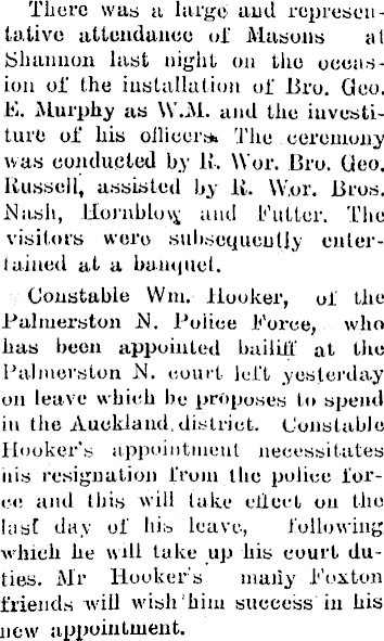 There was a largo and represen - tative attendance of Masons at Shannon last night on the occasion of the installation of Bro. Geo. E. Murphy as W.M. and the investiture of his oiliccrs> The ceremony was conducted by It. Wor. Bro. Geo. Russell, assisted by JR. Wor. Bros. El ash, ami If utter. The visitors were subsequently entertained at a banquet. Constable Win. Hooker, of the Palmerston JN. Police Iforee, who has been appointed bailiff at the Palmerston iN. court left yesterday on leave which lie proposes lo spend in the Auckland, district. Constable Hooker's appointment necessitates iiis resignation from the police force and this will take eilocl on the lust day of his leave, following which he will take up his court duties. Mr Hooker's many Ecxton friends will wish him success in his new appointment.