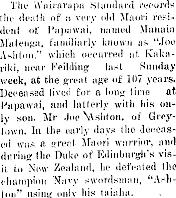 The Wairarapa Standard records the death of a very old Maori resident of I'apawai, named Maiiaia Matenga, familiarly known as “Joe Ashton," which occurred at Kakariki, near Feilding last Sunday week, at the great age of HIT years. Deceased lived for a long time at Papawai, and latterly with his only son, Mr .Joe \\shton, of Greytown. In the early days the deceased was a great Maori warrior, and during the Duke of Edinburgh’s visit to New Zealand, he defeated the champion Navy swordsman, “Ashton" using only his laiaha.