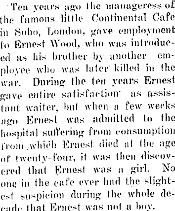 Ten years ago the manageress of the famous little Continental Cafe in Soho, London, gave employment to Ernest Wood, who was introduced as his brother by another employee who was later killed in (he war. During the ten years Ernest gave entire satisfaction - as assistant waiter, bill when a few weeks ago Ernest was admitted to the hospital suffering from consumption from which Ernest died at the age of twenty-four, it was llien discovered that Ernest was a girl. No one in the cafe ever had the slightest suspicion during the whole decade that Ernest was not a hoy.