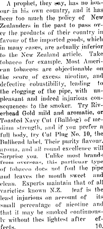 A prophet, they say, has no hon-our-in his own country, and it has been too much the policy of New Zealanders in the past to pass over the products of their country in favour of the imported goods, which in many cases, are actually interior to the New Zealand article. Take tobacco for example. Most Ameri,ean tobaccos are objectionable on t lie score of excess nicotine, and defective cobustibilify, leading to the clogging of (he pipe, with unpleasant and indeed injurious consequences to the smoker. Try Riverhead Gold mild and aromatic, or Toasted Navy Cat (Bulldog) of medium strength, and if you prefer a lull body, try Cut Plug No. 10, the Bullhead label. Their purity flavour, aroma, and all round excellence will surprise vou. Unlike most brands from overseas, this pnrtiouar type of lohacco does not foul the pipe and leaves (lie mouth sweet and dean. Experts maintain that of all varieties known N.Z. leaf is the least injurious on account of its small percentage of nicotine and that it may he smoked continuously without Hies lightest after effects. 10.