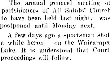 The annual {renewal meeting of parishioners of All Saints’ Church to have been held last night, was postponed until Monday next. A few days ago a sportsman shot a. white heron on Ihe Wn irarnpa Lake. It is understood (hat Court proceedings will follow.