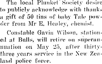 The local Plunkel Society desire to publicly acknowledge with thanks a gift of 50 tins of baby Talc powder from Mr E. Healey, chemist. Constable Gavin Wilson, stationed at Bulls, will retire on superannuation on May 25. after thirtythree years service in the New Zealand police force.