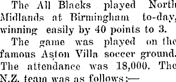 The All Blacks played North Midlands at Birmingham to-day, winning easily by 40 points to 3. The game was played on the famous Aston Villa soccer ground. The attendance was 18,000. The N.Z. team was as follows: —