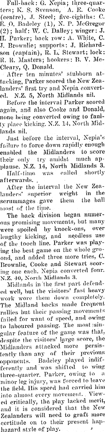 Full-back: G. Nepia; three-quar-ters; K. S. Svenson, A. E. Cooke (centre). .T. Steel; five-eighths: C. E. O. Badeley (1), N. P. McGregor (2); half: W- C. Dailey; winger: J. IT. Parker; hack row: A. White, C. •T. Brownlie; supports: J. Richardson (captain), R. L. Stewart; lock: R. R, Masters; hookers: B. V. MeCleary, Q. Donald. After ten minutes’ stubborn attacking, Parker scored the New Zealanders’ first try and Nepia converted. N.Z. 5, North Midlands nil. Before the interval Parker scored again, and also Cooke and Donald, none being converted owing to faulty place kicking. N.Z. 14, North Midlands nil. Just before the interval, Nepia’s failure to force down rapidly enough enabled the Midlanders to score their only try amidst much applause. N.Z. 14, North Midlands 3. Half-time was called shortly afterwards. . After the interval the New Zealanders' superior weight, in the scrummages gave them the ball most of the time. The back division began numerous promising movements, but many were spoiled by knoek-ons, over lengthy kicking, and needless use of the tooch line. Parker was playing the best game on the whole groond, and added three more tries, C. Brownlie, Cooke and Stewart scoring one each. Nepia converted four. N.Z. 40, Non h Midlands 3. Midlands in the first part defended well, but the visitors’ fast heavy work wore them down completely. The Midland backs made frequent rallies but their passing movements failed for want, of speed, and owing to laboured passing. The most singular feature of the game was that, despite the visitors’ large score, the Midlanders attacked more persistently than any of their previous opponents. Badeley played indifferently and was shifted to wing three-quarter. Parker, owing to a minor leg injury, was forced to leave the field. His speed had carried him into almost every movement. Viewed critically, the. play lacked merit, and it is considered that the New Zealanders will need to graft more certitude on to their present haphazard style of play. J