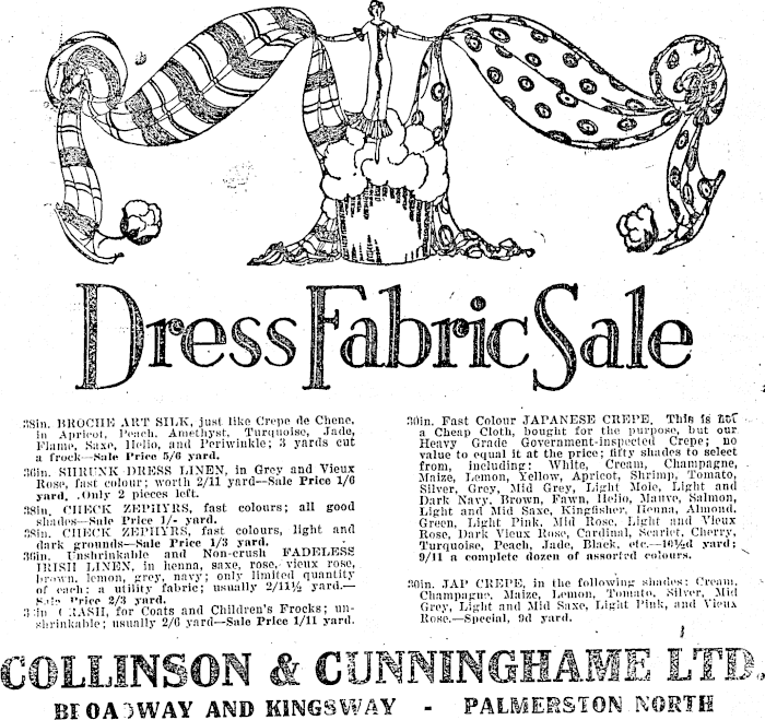 % % i£s J)ressfabric§ale OOin. Fast Colour .TArANESE CREPE. Tills Is EOf a Cheap Cloth, bought for the purpose, but our Heavy Grade Government-inspected Crepe; no value to equal It at the price; fifty shades to select from, including: White, Cream, Champagne, Maize, Lemon, Yellow, Apricot, Shrimp, Tomato, Silver, Grey, Mid Grey, Light Mole, Light and Dark Navy. Brown, Fawn, lleiio, Mauve, Salmon, Light and Mid Saxe, Kingfisher, Ilenna, Almond. Green, Light Pink. Mid Rose, Light and Vieux Rose, Dark Vicux Rose, Cardinal, Scarlet, Cherry, Turquoise, Poach, .lade, Black, etc.-- lip/td yard; 9/11 n complete dozen of assorted colours. t'.Oin. .TAP CREPE, in the following shades: Cream. Champagne. Maize, Lemon. Tomato. Silver, Mid Grey, Light and Mid Saxe, Light Pink, and Vieux Rose.—Special, 9<l yard. COLLINSON & CUNMNGHAME LTD BE 0 A SWAY AND KINGS WAY - PALMERSTON NORIK as in BROOIIE ART SILK, just like Crepe de Cheno. in Apricot, Peach, Amethyst, Turquoise, Jade, Flame, Saxo, lleiio, and Periwinkle; ti yards cut a l'roek—Sale Price 5/8 yard. Min SHRUNK DRESS LINEN, in Grey and Vieux Rose, fast colour; worth 2/11 yard—Sale Price 1/0 yard. .Only 2 pieces left. rlSiii CHECK ZEPHYRS, fast colours; all good shades- Sale Price 1/- yard. SSin. CHECK ZEPHYRS, fast colours, light and dark grounds—Sale Price l/S yard. • titiiii Unshrinkable and Non-crush FADELESS IRISH LINEN, in henna, saxe, rose, vieux rose, brown, lemon, grey, navy; only limited quantity of each: a utility fabric; usually 2/11Vj yard.— S.i'e '’rice 3/0 yard. „ ;j :in < ;:ASII, for Coats and Children’s Frocks; unshrinkable; usually 2/0 yard—Sale Price 1/11 yard.