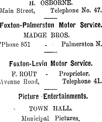 H. OSBORNE. Main Street, Telephone No. 47. Foxton-Palmerston Motor Service. MADGE BROS. 'Phone 851 - Palmerston N. Foxton-Levin Motor Service. F. ROUT - Proprietor. Avenue Road, Telephone 41. Picture Entertainments. TOWN HALL. Municipal Pictures.