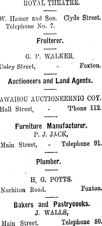 ROYAL THEATRE. W. Ilamer and Son. Clyde Street. Telephone No. 7. Fruiterer. 0. P. WALKER. Coley Street, - Foxton. Auctioneers and Land Agents. AWAHOU AUCTIONEERNIG COY. Hall Street. - ’Phone 112. Furniture Manufacturer. P. J. JACK, Main Street, - Telephone 91. Plumber. H. G. POTTS. Norbiton Road. Foxton. Bakers and Pastrycooks. J. WALLS, Main Street. Telephone 80.