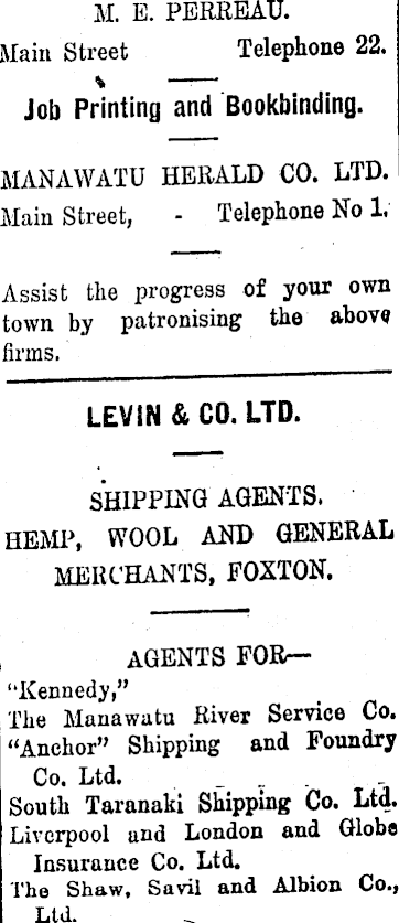 M. E. PERREAU. Main Street Telephone 22. Job Printing and Bookbinding. MANAWATU HERALD CO. LTD. Main Street, - Telephone No 1. Assist the progress of your own town by patronising the above firms. LEVIN & CO. LTD. SHIPPING agents. HEMP, WOOL AND GENERAL MERCHANTS, FOXTON. AGENTS FOR—“Kennedy,” The Manawatu River Service Co. “Anchor” Shipping and Foundry Co. Ltd. „ . South Taranaki Shipping Co. Ltd. Liverpool and London and Globe Insurance Co. Ltd. The Shaw, Savil and Albion Co., Ltd.