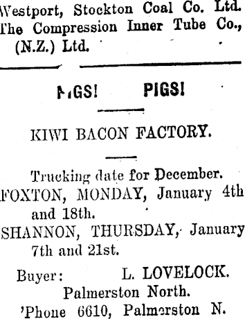 Westport, Stockton Coal Co. Ltd. The Compression Inner Tube Co., (N.Z.) Ltd. MGS! PIGS! KIWI BACON FACTORY. Trucking date for December. FOXTON, MONDAY, January 4th and 18th. SHANNON, THURSDAY, January 7th and 21st. Buyer: L. LOVELOCK. Palmerston North. 1 ’Phone 6610, Palmerston N.