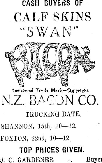 CASH BUYERS OF OALF SKINS “SWAN” ’£e«ts?erg(J Trrrlj Murk—' 'Ail yrtehl. N.Z. BACON CO. TRUCKING DATE, SHANNON, 15th, 10—12. FOXTON, 22nd, 10—12. TOP PRICES GIVEN. J. C. GARDENER .. Buyer ONm W i Sj® f. IsSC W** M m