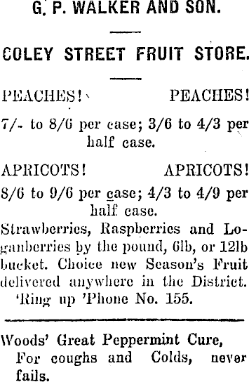 G. P. WALKER AND SON. COLEY STREET FRUIT STORE. PEACHES!' PEACHES! 7/- to 8/G per case; 3/6 to 4/3 per half case. APRICOTS! APRICOTS! 8/6 to 9/6 per case; 4/3 to 4/9 per half case. Strawberries, Raspberries and Loganberries by the pound, 61b, or 121 b bucket. Choice new Season’s Emit delivered anywhere in the District. ‘Rill” 1 up ’Phone No. 155. Woods’ Great Peppermint Cure, For coughs and Colds, never fails.