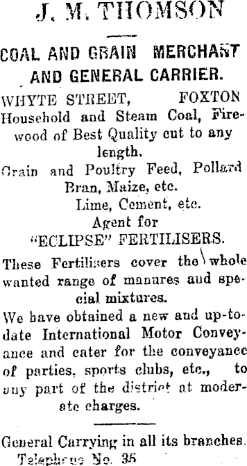 J. M. THOMSON COAL and grain merchant AND GENERAL CARRIER. WHYTE STREET, FOXTOR Household and Steam Coal, Firewood of Best Quality cut to any length. Crain and Poultry Feed, Pollard Bran, Maize, etc. Lime, Cement, etc. Agent for “ECLIPSE” FERTILISERS. These Fertilisers cover the Whole wanted range of manures aud special mixtures. We have obtained a new and up-to-date International Motor Conveyance and cater for the conveyance of parties, sports clubs, etc., to any part of the district at moderate charges. General Carrying in all its branches Ta!*pb«-S9 So. 3J>