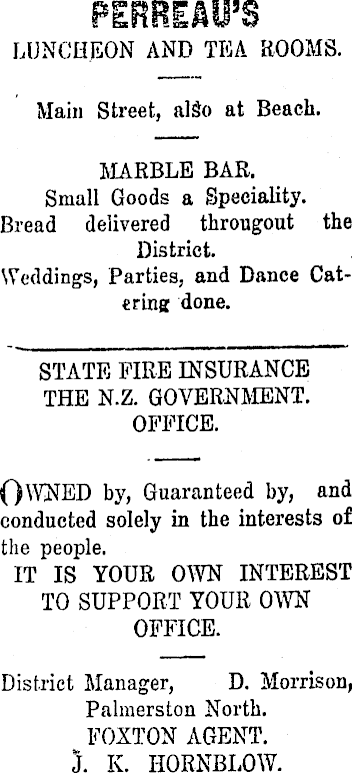 LUNCHEON AND TEA ROOMS. Main Street, a!3o at Beach. MARBLE BAR. Small Goods a Speciality. Bread delivered througout the District. Weddings, Parties, and Dance Catering done. STATE FIRE INSURANCE THE N.Z. GOVERNMENT. OFFICE. OWNED by, Guaranteed by, and conducted solely in the interests of the people. IT IS YOUR OWN INTEREST TO SUPPORT YOUR OWN OFFICE. District Manager, D. Morrison, Palmerston North. FOXTON AGENT. J. K. lIORNBLOW.