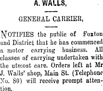 A. WALLS, GENERAL CARRIER, Notifies the public of Foxton and District that he has commenced a motor carrying business. All classes of carrying undertaken with the utmost care. Orders left at Mr J. Walls’ shop, Main St. (Telephone No. SO) will receive prompt attention.