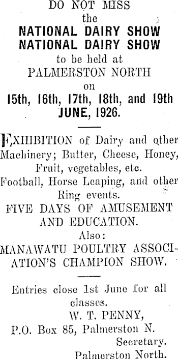 DO NOT MSS the NATIONAL DAIRY SHOW NATIONAL DAIRY SHOW to be held at PALMERSTON NORTH on 15th, 16th, 17th, 18th, and 19th JUNE, 1926. EXHIBITION of Dairy and Qtlier Machinery; Butter, Cheese, Honey, Fruit, vegetables, etc. Football, Horse Leaping, and other Ring events. FIVE DAYS OF AMUSEMENT AND EDUCATION. Also: MANAWATU POULTRY ASSOCIATION’S CHAMPION SHOW. Entries close Ist June for all classes. W. T. PENNY, P.O. Box 85, Palmerston N. Secretary. Palmerston North.