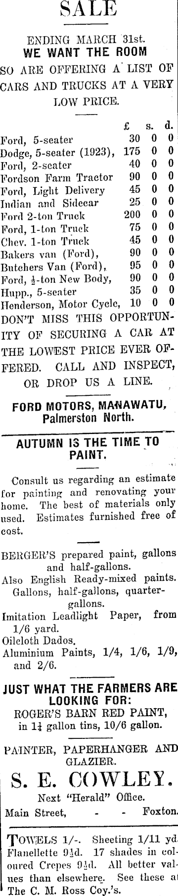 SALE ENDING MARCH 31st. WE WANT THE ROOM SO ARE OFFERING A' LIST OF CARS AND TRUCKS AT A VERY LOW PRICE. £ s. d. Ford, 5-seater 30 0 0 Dodge, 5-seater (1923), 175 0 0 Ford, 2-seater 40 0 0 Fordson Farm Tractor 90 0 0 Ford, Light Delivery 45 0 0 Indian and Sidecar 25 0 0 Ford 2-ton Truck 200 0 0 Ford, 1-ton Truck 75 0 0 Cliev. 1-ton Truck 45 0 0 Bakers van (Ford), 90 0 0 Butchers Van (Ford), 95 0 0 Ford, 4-ton New Body, 90 0 0 Hupp., 5-seater 35 0 0 Henderson, Motor Cycle, 10 0 0 DON’T MISS THIS OPPORTUNITY OF SECURING A CAR AT THE LOWEST PRICE EVER OFFERED. CALL AND INSPECT, OR DROP US A LINE. FORD MOTORS, MANAWATU, Palmerston North. AUTUMN IS THE TIME TO PAINT. Consult us regarding an estimate for painting and renovating your home. The best of materials only used. Estimates furnished free of cost. BERGER’S prepared paint, gallons and half-gallons. Also English Ready-mixed paints. Gallons, half-gallons, quartergallons. Imitation Leadlight Paper, from 1/6 yard. Oilcloth Dados. Aluminium Paints, 1/4, 1/6, 1/9, and 2/6. JUST WHAT THE FARMERS ARE LOOKING FOR: ROGER’S BARN RED PAINT, in 11 gallon tins, 10/6 gallon. PAINTER, PAPERHANGER AND GLAZIER, S. E. COWLET. Next “Herald” Office. Main Street, - - Foxton. TOWELS i/_. sheeting 1/11 yd. Flanellette 94d. 17 shades in coloured Crepes 9LI. All better values than elsewhere. See these at The C. M. Ross Coy.’s.