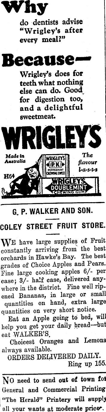 Why do dentists advise “Wrigley’s after every meal?” Because— Wrigley’s does for teeth what nothing else can do. Good for digestion too, and a delightful sweetmeat. WRKIfYS Made In AiutraUa The flavour IrU'S-US KSLEYS RK sum H 64 rm G. P. WALKER AND SON. COLEY STREET FRUIT STORE. WE have large supplies of Fruit constantly arriving from the best orchards in Hawke’s Bay. The best grades of Choice Apples and Pears. Fine large cooking apples 6/- per case; 3/- half case, delivered anywhere in the district. Fine well ripened Bananas, in large or small quantities on hand, extra large quantities on very short notice. Eat an Apple going to bed, will help you get your daily bread —but eat WALKER’S. Choicest Oranges and Lemons always available. ORDERS DELIVERED DAILY. Ring up 155. NO need to send out of town fol General and Commercial Printing “The Herald” Printery will supply all your wants at moderate pricer.