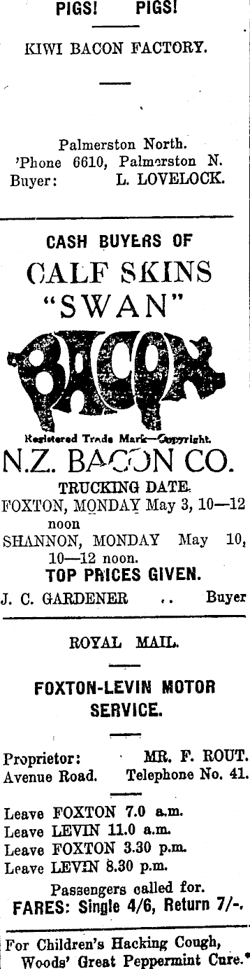 PIGS! PIGS! KIWI BACON FACTORY. Palmerston North. ’Phone 6610, Palmerston N. Buyer: L. LOVELOCK. CASH BUYERS OF CALF SKINS “SWAN” Trad* Mark—Ctopjrrlght N.Z. BACON CO. TRUCKING DATE-. FOXTON, MONDAY May 3, 10—12 noon SHANNON, MONDAY May 10, 10 —12 noon. TOP PRICES GIVEN. J. C. GARDENER .. Buyer ROYAL MAIL FOXTON-LEVIN MOTOR SERVICE. Proprietor: MR. F. ROUT. Avenue Road. Telephone No. 41. Leave FOXTON 7.0 a.m. Leave LEVIN 11.0 a.m. Leave FOXTON 3.30 p.m. Leave LEVIN 8.30 p.m. Passengers called for. FARES: Single 4/6, Return 7/-. For Children’s Hacking Cough, Woods’ Great Peppermint Cure.*