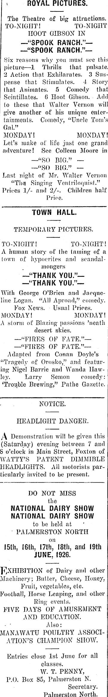 ROYAL PICTURES. The Theatre of big attractions. TO-NIGHT! TO-NIGHT! HOOT GIBSON IN —“SPOOK RANCH.”— —“SPOOK RANCH.”— Six reasons why you must see this picture—l Thrills that pulsate. 2 Action that Exhilarates. 3 Suspense that Stimulates. 4 Story that Animates. 5 Comedy that Scintillates. G Hoot Gibson. Add to these that Walter Vernon will give another of his unique entertainments. Comedy, “Uncle Tom’s Gal.” MONDAY! MONDAY! Let’s make of life just one grand adventure! See Colleen Moore in —“SO BIG.” —“SO BIG.” Last night of Mr. Walter Vernon “Thq Singing Ventriloquist.” Prices 1/- and 2/-. Children half Price. TOWN HALL TEMPORARY PICTURES. TO-NIGHT! TO-NIGHT! A human story of the taming of a town of hypocrites and scandalmongers —“THANK YOU.”— —“THANK YOU.”— With George O’Brien and Jacqueline Logan. “All Aproad,” comedy. Fox News. Usual Prices. MONDAY! MONDAY! A storm of Blazing passions ’neath desert skies. —“FIRES OF FATE.”— —“FIRES OF FATE.”— Adapted from Conan Doyle’s “Tragedy of Orosko,” and featuring Nigel Barrie and Wanda Hawley. Larrv Semon comedy: ‘Troiible Brewing,” Pathe Gazette. NOTICE. HEADLIGHT DANGER. j\ Demonstration will be given this (Saturday) evening between 7 and S o’clock in Main Street, Foxton of WATTY’S PATENT DIMMIBLE HEADLIGHTS. All motorists particularly invited to be present. DO NOT AHSS the NATIONAL DAIRY SHOW NATIONAL DAIRY SHOW to be held at PALMERSTON NORTH on 15th, 16th, 17th, 18th, and 19th JUNE, 1926. INHIBITION of Dairy and other Machinery; Butter, Cheese, Honey, Fruit, vegetables, etc. Football, Horse Leaping, and other Ring events. FIVE DAYS OF AMUSEMENT AND EDUCATION. - ■ Also: MANAWATU POULTRY ASSOCIATION’S CHAMPION SHOW. Entries close Ist June for all classes. V r . T. PENNY, P.O. Box 85, Palmerston N. Secretary. Palmerston North.