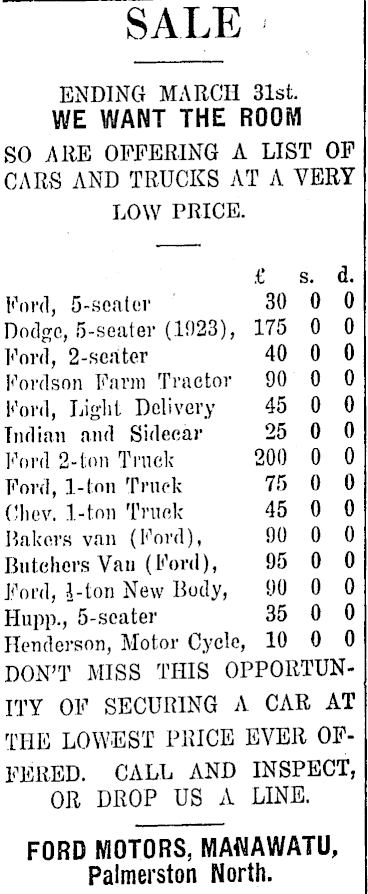 SALE ENDING MARCH 31st. WE WANT THE ROOM SO ARE OFFERING A LIST OF CARvS AND TRUCKS AT A VERY LOW PRICE. £ s. d. DON’T MISS THIS OPPORTUNITY OF SECURING A CAR AT THE LOWEST PRICE EVER OFFERED. CALL AND INSPECT, OR DROP US A LINE. FORD MOTORS, MAWAWATU, Palmerston North.