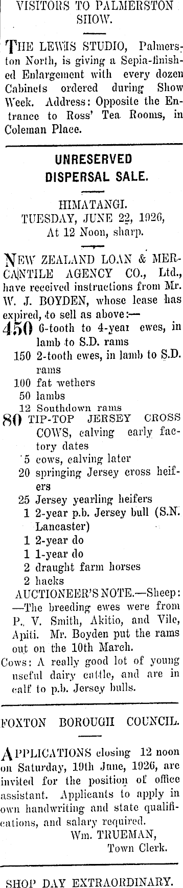 VISITORS TO PALMERSTON SHOW. THE LEWIS STUDIO, Palmers : ton North, is giving a Sepia-finish-ed Enlargement with every dozen Cabinets ordered during Show Week. Address: Opposite the Entrance to Ross’ Tea Rooms, in Coleman Place. UNRESERVED DISPERSAL SALE. HIMATANGI. TUESDAY, JUNE 22, 1920, At 12 Noon, sharp. NEW ZEALAND LOAN & MERCANTILE AGENCY CO., Ltd., have received instructions from Mr. W. J. BOYDEN, whose lease has expired, .to sell as above: — 450 0-tooth to 4-yeai ewes, in lamb to S.D. rams 150 2-tooth ewes, in lamb to S.D. rams 100 fat wethers 50 lambs 12 Southdown rams 80 TIP-TOP JERSEY CROSS COWS, calving early factory dates 5 cows, calving later 20 springing Jersey cross heifers 25 Jersey yearling heifers 1 2-year p.b. Jersey bull (S.N. Lancaster) 1 2-year do 1 1-year do 2 draught farm horses 2 hacks AUCTIONEER’S NOTE—Sheep: —The breeding ewes were from P„ V. Smith, Akitio, and Vile, Apiti. Mr. Boyden put the rams out on the 10th March. Cows: A really good lot of young useful dairy cattle, and are in calf to p.b. Jersey bulls. FOXTON BOROUGH COUNCIL. Applications closing 12 noon oil Saturday, 19th June, 1920, are invited for the position of office assistant. Applicants to apply in own handwriting and state qualifications, and salary required. Wm. TRUEMAN, Town Clerk. SHOP DAY EXTRAORDINARY.