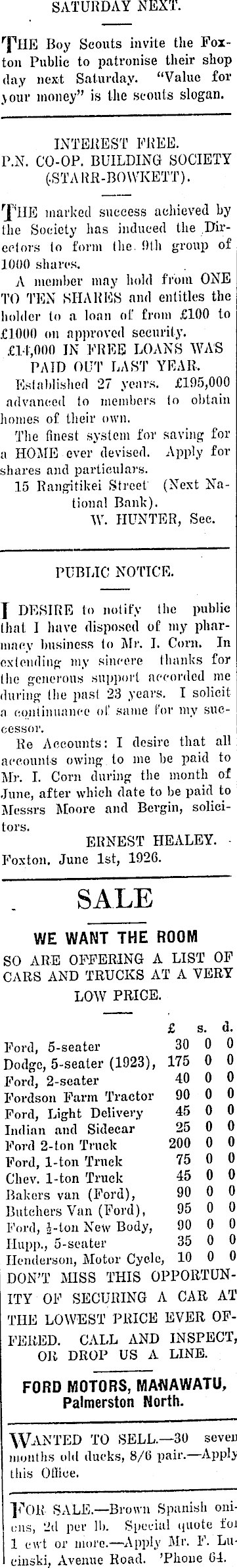 SATURDAY NEXT. 'PIIE Boy Scouts invite the Foxton Public to patronise their shop day next Saturday. “Value for your money” is the scouts slogan. INTEREST FREE. P.N. CO-OP. BUILDING SOCIETY (.STARR-BOWKETT). r JiIE marked success achieved by Ihe Society has induced the Directors to form the !)th group of 1000 shares. A member may hold from ONE TO TEN SHARES and entitles the holder to a loan of from £IOO to £IOOO on approved security. £l-1,000 IN FREE LOANS WAS PAID OUT LAST YEAR. Established 27 years. £195,000 advanced to members to obtain homes of their own. The finest system for saving for a HOME ever devised. Apply for shares and particulars. 15 Rangitikei Street (Next National Bank). W. HUNTER, Sec. PUBLIC NOTICE. J DESIRE to notify t he public that I have disposed of my pharmacy business to Mr. I. Corn. In extending my sincere thanks lor the generous support accorded me during the past 23 years. I solicit a continuance of same for my successor. Re Accounts: I desire that all accounts owing to me be paid to Mr. I. Corn during the month of June, after which date to be paid to Messrs Moore and Bergin, solicitors. ERNEST HEALEY. - Foxton. June Ist, 192 G. SALE WE WANT THE ROOM SO ARE OFFERING A LIST OF CARS AND TRUCKS AT A VERY LOW PRICE. £ s. d. Ford, 5-seater 30 0 0 Dodge, 5-seater (1923), 175 0 0 Ford, 2-seater 40 0 0 Fordson Farm Tractor 90 0 0 Ford, Light Delivery 45 0 0 Indian and Sidecar 25 0 0 Ford 2-ton Truck 200 0 0 Ford, 1-ton Truck 75 0 0 Cliev. 1-ton Truck 45 0 0 Bakers van (Ford), 90 0 0 Butchers Van (Ford), 95 0 0 Ford, i-ton New Body, 90 0 0 Hupp., 5-seater 35 0 0 Henderson, Motor Cycle, 10 0 0 DON’T MISS THIS OPPORTUNITY OF SECURING A CAR AT THE LOWEST PRICE EVER OFFERED. CALL AND INSPECT, OR DROP US A LINE. FORD MOTORS, MANAWATU, Palmerston North. Wanted to sell.—so seven months old ducks, 8/0 pair.—Apply this Office. "jfOR, SALE. —Brown Spanish onions, 2d per Hi. Special quote for 1 cwt or more. —Apply Mr. F. LuI einski, Avenue Road. ’Phone 04.