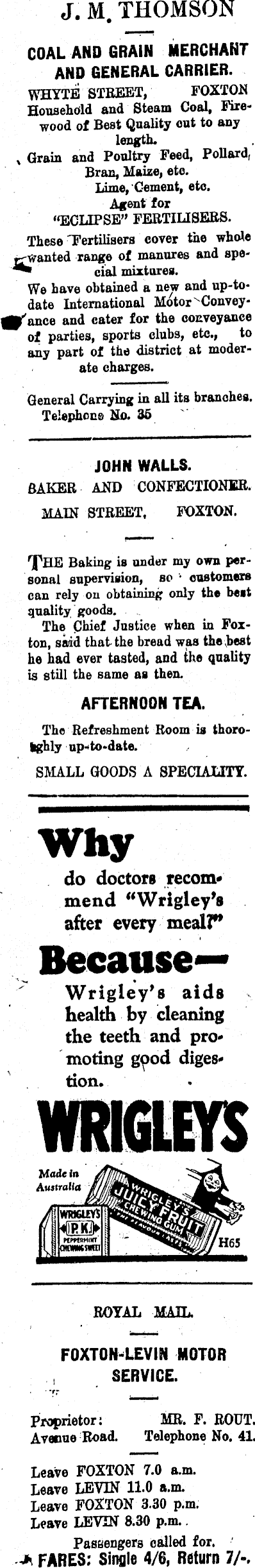 J. M THOMSON COAL AND GRAIN MERCHANT AND GENERAL CARRIER. WHYTE STREET, FOXTON Household and Steam Coal, Firewood of Beat Quality out to any length. , Grain and Poultry Feed, Pollard, Bran, Make, etc. Lime, Cement, etc. Agent for “ECLIPSE” FERTILISERS. These "Fertilisers cover the whole range of manures and special mixtures. We have obtained a new and up-to-date International Motor ance and cater for the conveyance of parties, sports clubs, etc., to any part of the district at moderate charges. General Carrying in all its branches. Telephone No. 36 JOHN WALLS. BAKER AND CONFECTIONER. MAIN STREET, FOXTON. r JPHE Baking is under my own personal supervision, so '• customers can rely on obtaining only the best quality goods. The Chief Justice when in Foxton, said that the bread was the best he had ever tasted, and the quality is still the same as then. AFTERNOON TEA. The Refreshment Room is thoroughly up-to-date. SMALL GOODS A SPECIALITY. Why do doctors recommend “Wrigley’s after every meal?” Because— Wrigley’s aids health by cleaning the teeth and promoting good digestion. Made in Australia WW6IEYS ii H 65 otimswn ROYAL MAIL. FOXTON-LEVIN MOTOR SERVICE. Proprietor: MR. F. ROUT. Avenue Road. Telephone No. 41. Leave FOXTON 7.0 a.m. Leave LEVIN 11.0 a.m. Leave FOXTON 3.30 p.m. Leave LEVIN 8.30 p.m. Passengers called for. * FARES; Single 4/6, Return 7/-,