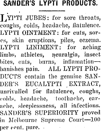 SANDER’S LYPTI PRODUCTS. JjYPTI JUBES: for sore throats, coughs, colds, headache, flatulence. LYPTI OINTMENT: for cuts, sores, skin eruptions, piles, eczema. LYPTI LINIMENT: for aching limbs, athletes, neuralgia, insect bites, cuts, burns, inflamation —> banishes pain. ALL LYPTI PRODUCT'S contain the genuine SANDER’S EUCALYPTI . EXTRACT, unrivalled far flatulence, coughs, colds, headache, toothache, earache, sleeplessness, all infections. SANDER’S SUPERIORITY proved in Melbourne Supreme Court —100 per cent. pure.
