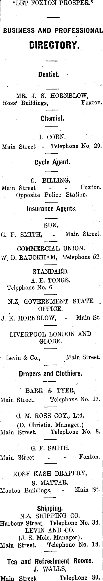 “LET FOXTON PROSPER.” BUSINESS AND PROFESSIONAL DIRECTORY. Dentist. MR. J. S'. HORNBLOW. Ross’ Buildings, Foxton. Chemist. I. CORN. Main Street - Telephone No. 29. Cycle Ajgent. C. BILLING, ! Main Street - - Foxton. Opposite Police Station. Insurance Agents. SUN, G. F. SMITH, - Main Street. COMMERCIAL UNION. W. D. BAUCKHAM, Telephone 52. STANDARD. A. E. TONGS. Telephone No. 6 N.Z. GOVERNMENT STATE . OFFICE. J. K. HORNBLOW, - Main St. LIVERPOOL LONDON AND GLOBE. Levin & Co., Main Street. Drapers and Clothiers. ' BARR & TVER, Main Street. Telephone No. 17. C. M. ROSS COY., Ltd. (D. Christie, Manager.) Main Street. Telephone No. 8. G. F. SMITH Main Street - - Foxton. ROSY KASH DRAPERY, S. MATTAR. Moutoa Buildings, - Main St. Shipping. N.Z. SHIPPING CO. Harbour Street Telephone No. 34. LEVIN AND CO. (J. S. Moir, Manager). Main Street. Telephone No. 18. Tea and Refreshment Rooms. J. WALLS, Main Street. Telephone 80.