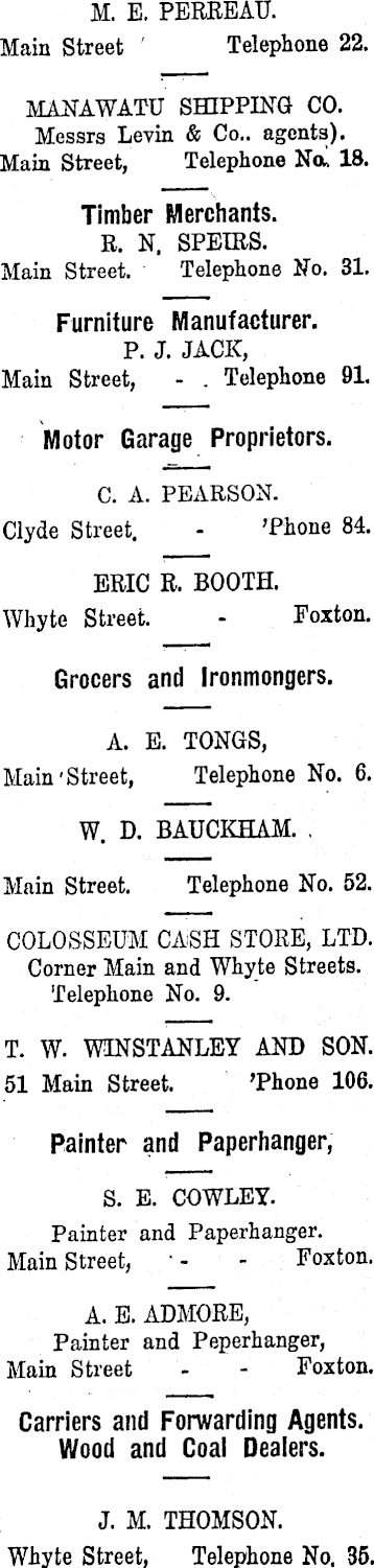 M. E. PERREAU. Main Street Telephone 22. MANAWATU SHIPPING CO. Messrs Levin & Co., agents). Main Street, Telephone Na. 18. Timber Merchants. R. N, SPEIRS. Main Street. Telephone No. 31. Furniture Manufacturer. P. J. JACK, Main Street, - . Telephone 91. Motor Garage Proprietors. C. A. PEARSON. Clyde Street. - ’Phone 84. ERIC R. BOOTH. Whyte Street. - Foxton. Grocers and Ironmongers. A. E. TONGS, Main'Street, Telephone No. 6. W. D. BAUCKHAM. Main Street. Telephone No. 52. COLOSSEUM CASH STORE, LTD. Corner Main and Whyte Streets. Telephone No. 9. T. W. WINSTANLEY AND SON. 51 Main Street. 'Phone 106. Painter and Paperhanger, S. E. COWLEY. Painter and Paperhanger. Main Street, • - - Foxton. A. E. ADMORE, Painter and Peperhanger, Main Street - - Foxton. Carriers and Forwarding Agents. Wood and Coal Dealers. J. M. THOMSON. Whyte Street, Telephone No. 35.