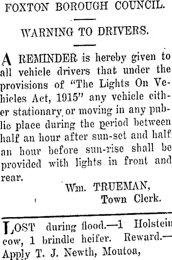 FOXTON BOROUGH COUNCIL. WARNING TO DRIVERS. \ REMINDER, is hereby given to all vehicle drivers that under the provisions of “The Lights On Vehicles Act, 1915” any vehicle either stationary, or moving in any public place during the period between half an hour after sun-set and half an hour before sun-rise shall be provided with lights in front and rear. Win. TRUEMAN, i Town Clerk. J,OST during flood.—-1 Holstein COW, 1 brindle heifer. Reward.— Apply T. J. Newth, Moutoa,