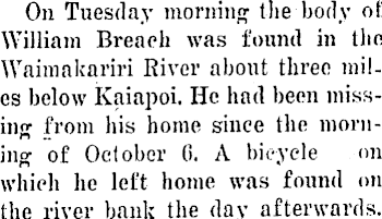 On Tuesday morning the body of William Breach was found in the Waimakariri River about three miles below Kaiapoi. He had been missing from bis home since the morning of October 0. A bicycle on which lie left home was found on the river bank the day afterwards.