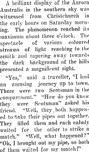 A brilliant display of the Aurora Australis in the southern sky was witnessed from Christchurch in the early hours on Saturday morning. The phenomenon reached its maximum about three o’clock. The spectacle of various coloured streams of light reaching to the zenith-and tapering away towards the dark background of the hills presented a magnificent sight. “Yes,” said a traveller, “I had an amusing journey up to town. There were two Scotsman in the compartment.” “How do you know tliey were Scotsman” asked his friend. “Well, they.both happened to lake their pipes out together. They filled them and each calmly waited for the other to strike a match.” “Well, what happened?” “Oil, I brought out my pipe, so both of them waited for my match!”