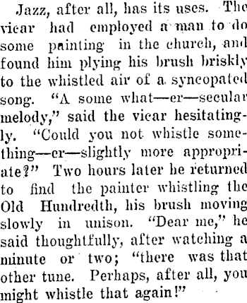 Jazz, after all, has its uses. The vicar had employed a man to do some printing in the church, and found him plying his brush briskly to the whistled air of a. syncopated song. “A some what —er —secular melody,” said the vicar hesitatingly. “Could you not whistle something—er—slightly more appropriate!” Two hours later he returned to find the painter whistling the Old Hundredth, his brush moving slowly in unison. “Dear me,” he said thoughtfully, after watching a minute or two; “there was that other tune. Perhaps, after all, you might whistle that again!”