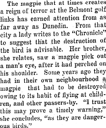 The magpie that at times creates a reign of terror at the Belmont golf links has earned attention from as far away as Dunedin. From that city a lady writes to the “Chronicle” to suggest that the destruction of the bird is advisable. Her brother, she relates, saw a magpie pick out a man’s eye, after it had perched on his shoulder. Some years ago they had in their own neighbourhood a magpie that had to be destroyed owing to its habit of flying at children, and other passers-by. “I trust this may prove a timely warning,” she concludes, “as they are dangerous birds.”