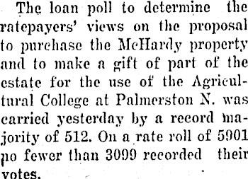The loan poll to determine the ratepayers’ views on the proposal to purchase the McHardy property and to make a gift of part of the estate for the use of the Agricultural College at Palmerston X. was carried yesterday by a record majority of 512. On a rate roll of 5901 po fewer than 3099 recorded their votes.